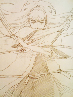 でねでね!カラオケで忍たまブリーチパロについて盛り上がってですね!双忍で花天狂骨と双魚理使ってたら格好良くね?って話になって三郎描いてみた。↓